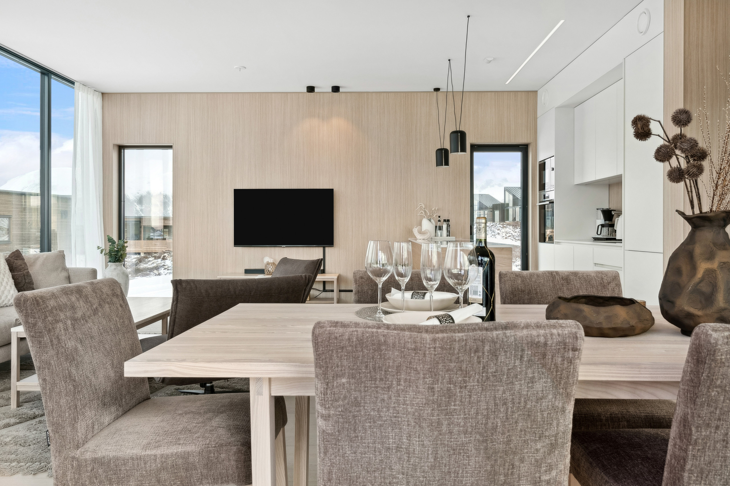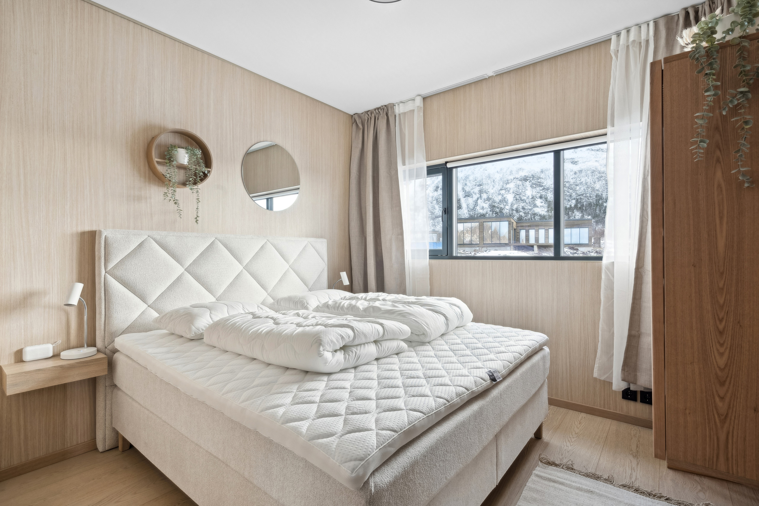 The cabin has 2 bedrooms, one with a double bed and the other with a queen-size bed and a bunk bed - ideal for families or groups of up to 6 people. The bathroom has a washing machine. The cabin is stylishly furnished with exclusive designer furniture and a well-equipped kitchen. In the outdoor area you will find an electric charger (incl.) for an electric car and a terrace with outdoor furniture.
