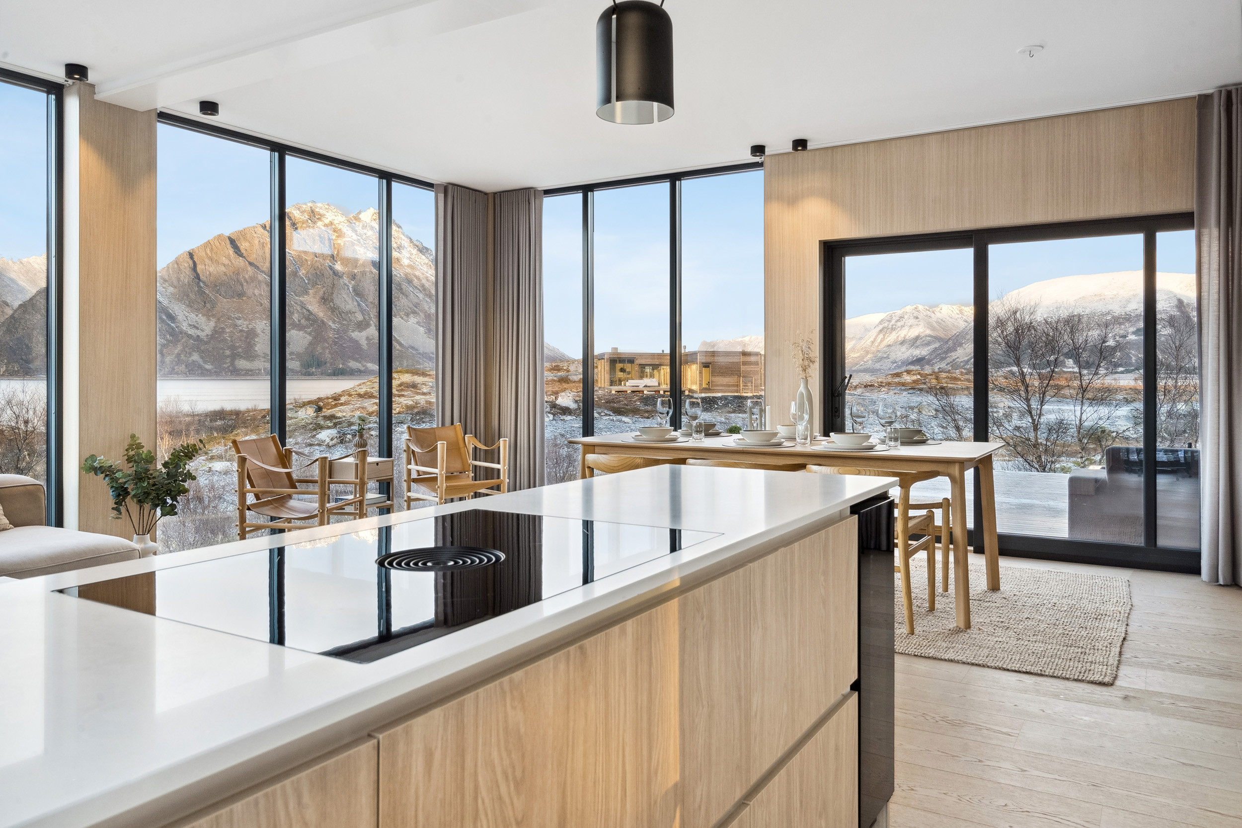 Set at the end of the road, this is one of the more private lodges in Lyngvær. Elevated in the terrain, it offers sweeping 180-degree sea views and quiet seclusion.