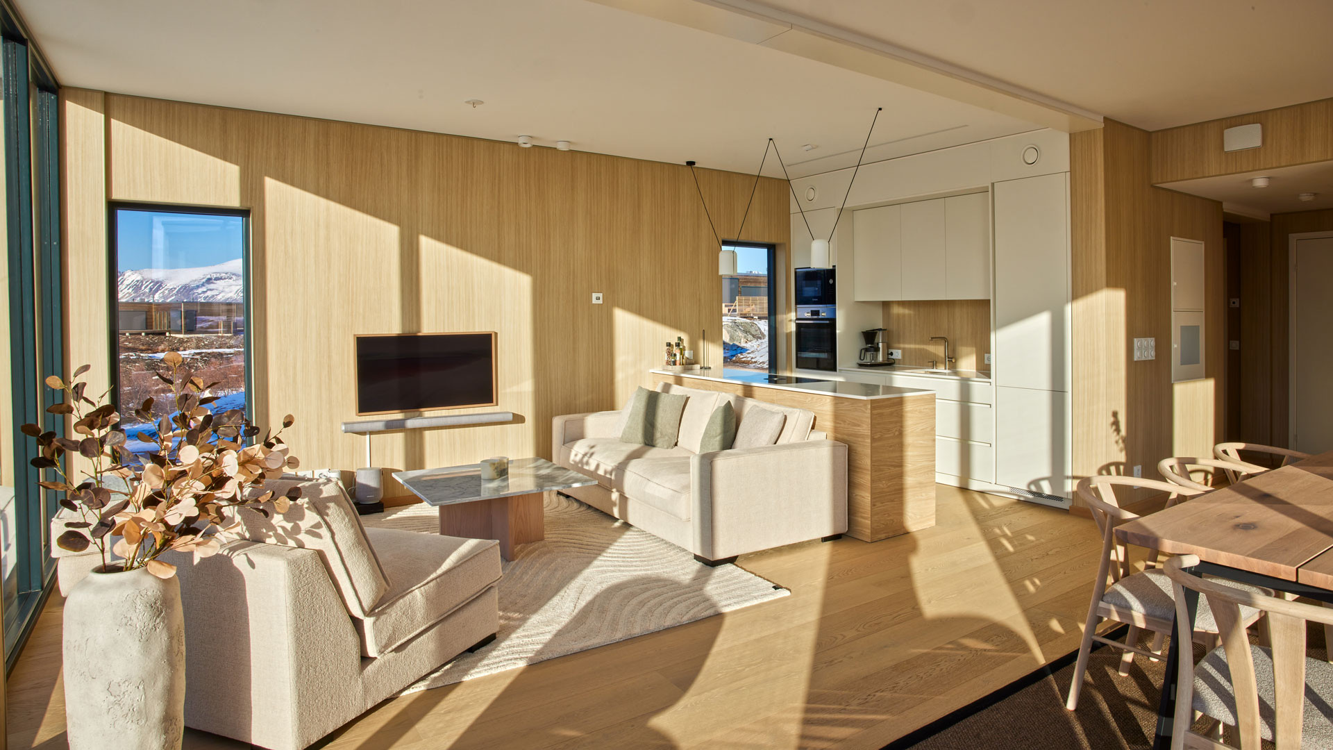 This upgraded lodge includes a larger terrace, an EV charger (included) and full floor heating for convenient, year-round stays. The lodge boasts a fully equipped American-style kitchen with top-notch appliances, including an induction cooktop, dishwasher, filter coffee machine, and all the kitchenware you'll need to prepare delicious meals. Enjoy the convenience of a washing machine and dryer, making your stay both comfortable and practical.